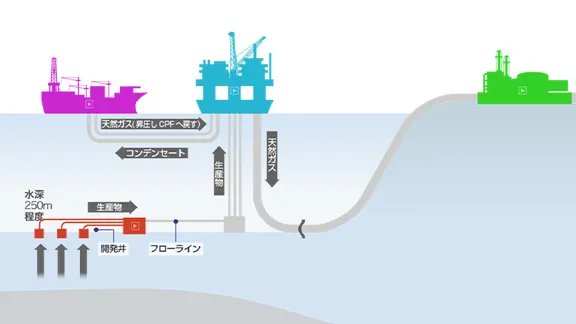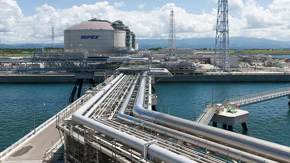 日本の国内天然ガス生産量は、国内消費量の約4%足らずであるため、残りの約96%はインドネシア、オーストラリア、中東地域などからLNGとして輸入しています。当社は、中長期的に十分な天然ガスの供給能力を確保する目的で、年間890万トンのLNGを生産可能なイクシスLNGプロジェクトを2018年よりオペレーターとして操業開始しそのうち約7割を日本へと供給しています。また新潟県上越市(直江津港)にLNG受入基地を建設し、2013年より操業しています。