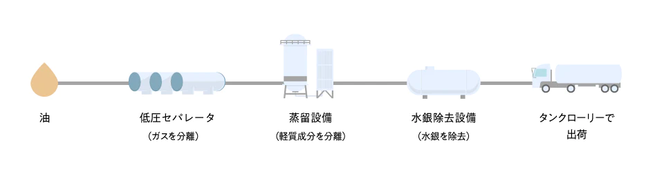 天然ガスから分離された油分にはガスや水銀などが含まれることがあります。そこで、蒸留装置によってガスを分離し吸着剤にて水銀を除去します。処理後の油分はコンデンセートと呼ばれ、製油所などに出荷されLPG・ナフサ(石油化学製品の原料)・ガソリン・灯油・軽油・重油などの石油製品に精製されます。