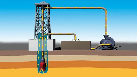 掘削を進めるときに出る土や石などの掘りくずは、「泥水」と呼ばれる粘性のある液体を地上から強力なポンプで流し込み、ビットの先端から勢いよく噴き出させることで地上まで押し上げて運び出します。泥水は、地下のビットやパイプの冷却や、掘った地層の壁の補強という役割も果たします。
