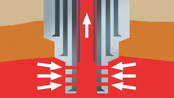 掘り進めた井戸の壁は、崩れないように「ケーシング」と呼ばれる鉄管を降ろして補強します。区間ごとの穴の大きさに合わせて太いものから細いものへと順に降ろして、掘った地層との間をセメントで固定します。井戸を掘り終えると、目的となる深度でケーシングに穴をあけ、石油や天然ガスを採取します。