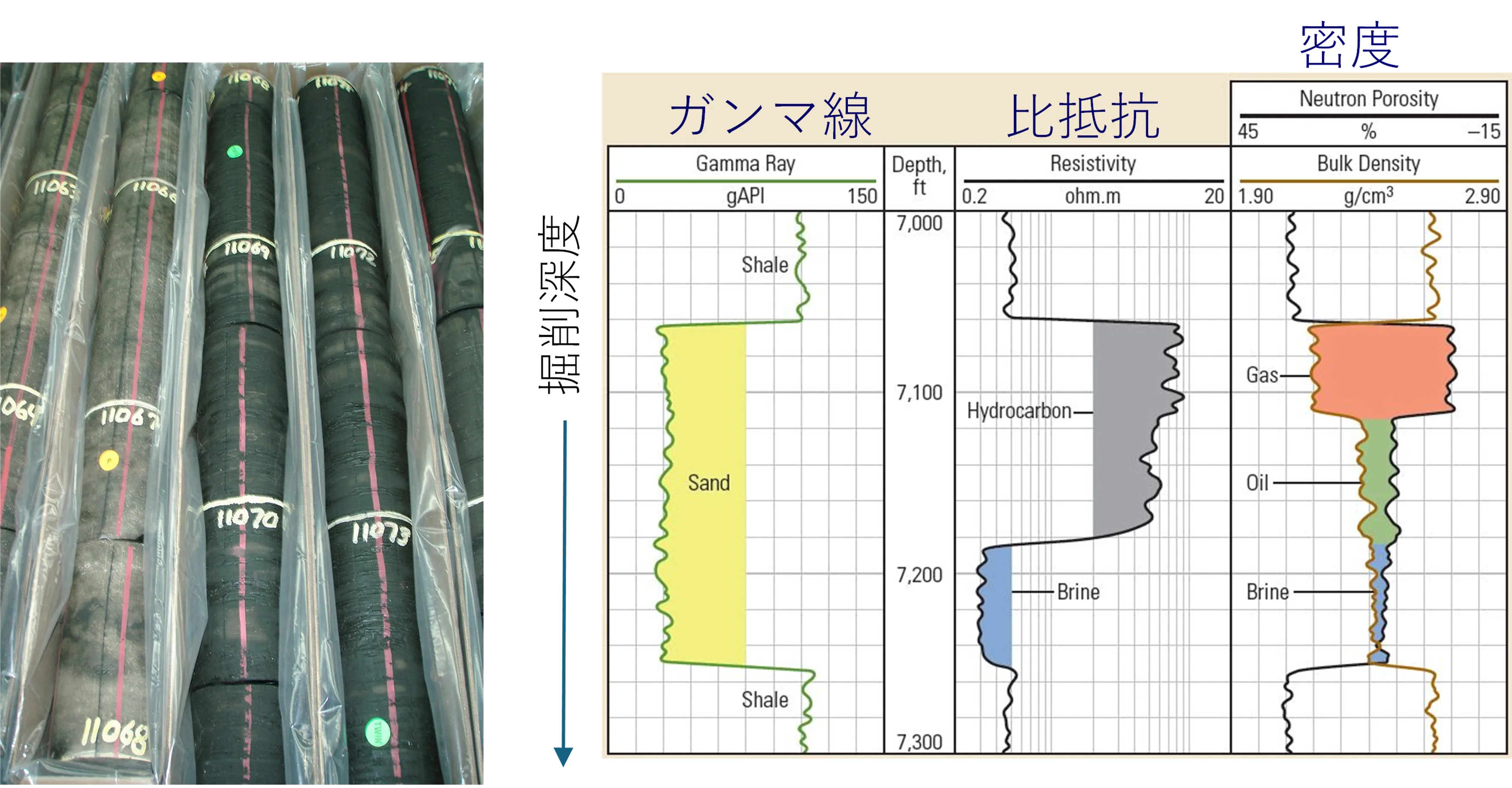 評価井や試掘井からは、岩石コアのサンプルや、ガンマ線・比抵抗・密度などの物理的特性、さらには油やガスなどの流体サンプル、井戸内の圧力・温度データを取得できます。これらの情報を総合的に活用することで、地下の構造や貯留層の特徴をより正確に把握できます。
