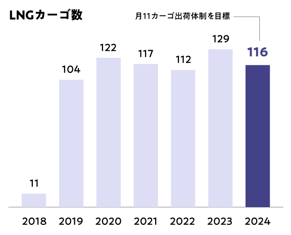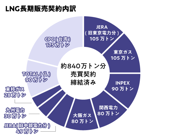 本プロジェクトでは、年産840万トン分の売買契約は締結済み、LNGの約7割が日本の買主向けであり、日本の輸入量の約1割強に相当するLNGを生産しています。既に年間930万トンの生産を行うための施設能力を向上しており、今後も安全・安定生産体制の維持・強化、エネルギーの安定供給に努めていきます。
