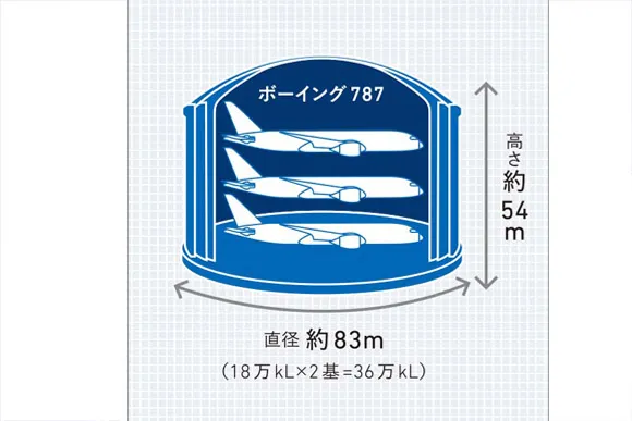 - 荷揚げされたLNGは、高さ約54m、直径約83mのLNGタンク2基に貯蔵されます。その容量は合計36万kL。1つのタンクでボーイング787が3機格納できる大きさです。