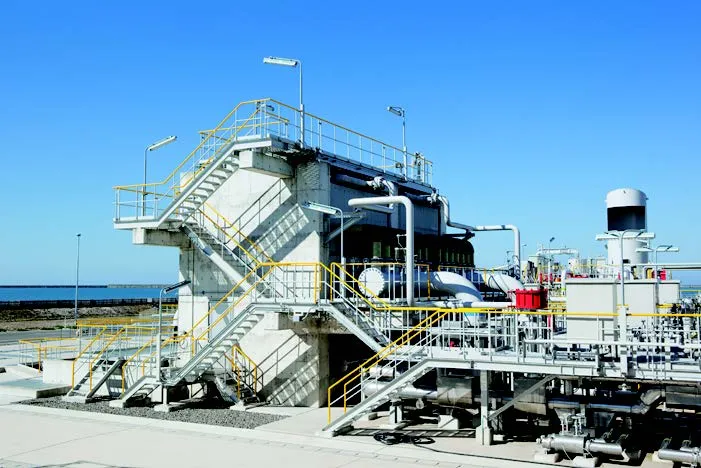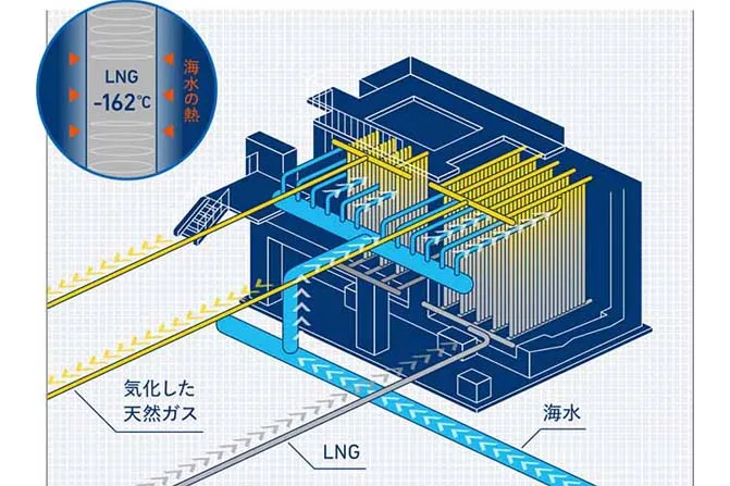 -162℃の液体であるLNGを、海水の熱を利用し温め気化させて、天然ガスに戻します。