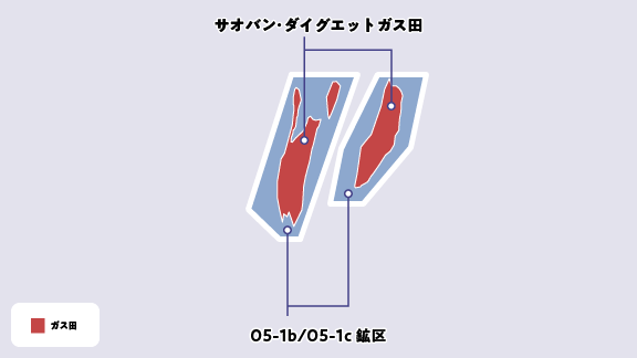 当社は、2004年にベトナム社会主義共和国、ホーチミン市から南東350キロメートルに位置する05-1b/05-1c鉱区を取得し、2010年にダイグエット(DN)構造に試掘井を掘削しガス・コンデンセートの集積を発見、2014年にはサオバン(SV)構造に試掘井を掘削しガス・コンデンセートの集積を発見しました。2018年に最終投資決定を行い、2020年にサオバンガス田の生産を開始、ダイグエットガス田においても2022年より生産を開始しました。