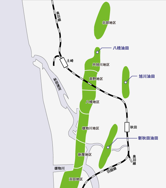 秋田平野を流れる雄物川流域一帯では、大正時代から油やガスの探鉱が行われており、当社は設立と同時に八橋油田を引き継ぎ、探鉱・開発技術の向上を図りながら開発を進めてきました。昭和30年前後には年間25万kl超の原油を生産する大油田となりました。587万klの累計原油生産量(令和5年12月末時点)を誇る日本最大級の油田です。現在も秋田の市街地で日々ポンピングによる生産を行っています。