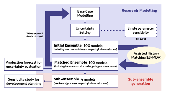 当社では、効率的な不確実性評価およびそれを踏まえた開発計画策定を行うワークフローの開発に取り組んでいます。評価の中で数多くのモデルを作成する必要があり、貯留層モデルの予測が実測データに合うようにモデルの補正を行うヒストリーマッチングを人の手で行うことは容易ではありません。そこで当社は自動ヒストリーマッチング技術を組み合わせたワークフローを構築し、大幅な作業時間の短縮を達成しました。このような取り組みにより、貯留層リスクの理解と精度を高め、リスクマネジメントを効果的に導入した油ガス田の開発を行っています。