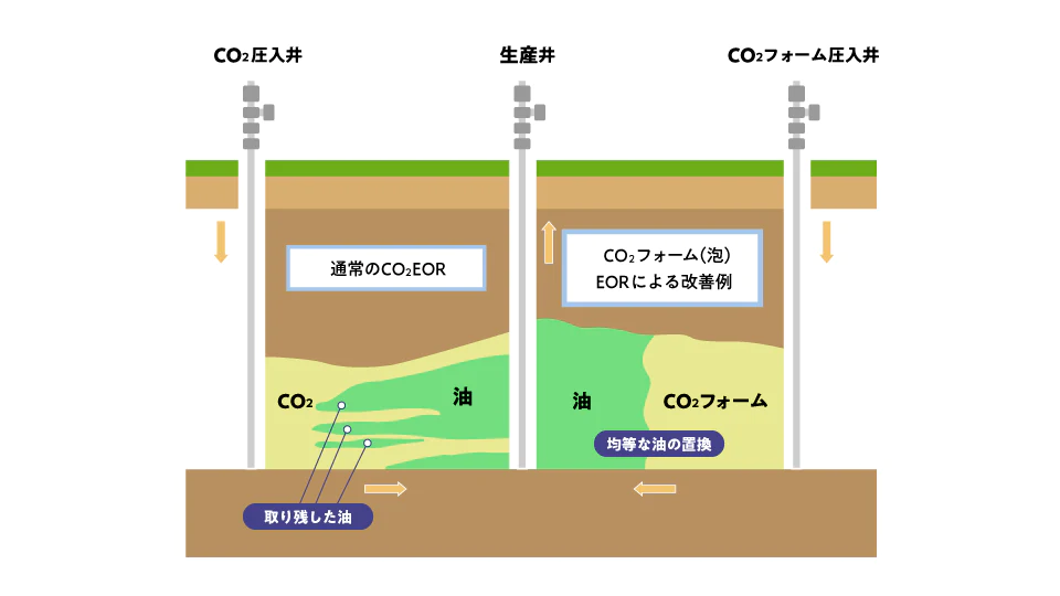 一方、炭酸ガスは油よりも軽く、流れ易い(粘性が低い)流体ゆえに、油層の高浸透率部分のみに浸入してしまい、地下に大量の油が取り残されてしまう事があります。そこで当社では、この弱点を克服する技術として、CO2と水を混合し泡(フォーム)を形成させる、あるいはCO2と増粘剤を混合し粘性を上げる事により、CO2単体よりも流れにくい流体にして、地下の油を更に効率的に回収できる特殊技術の研究開発を行っています。