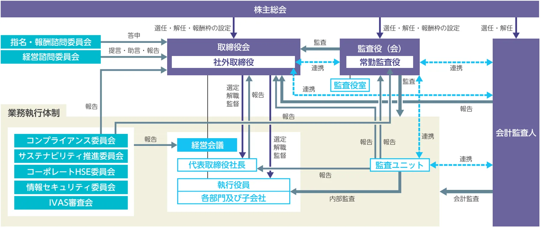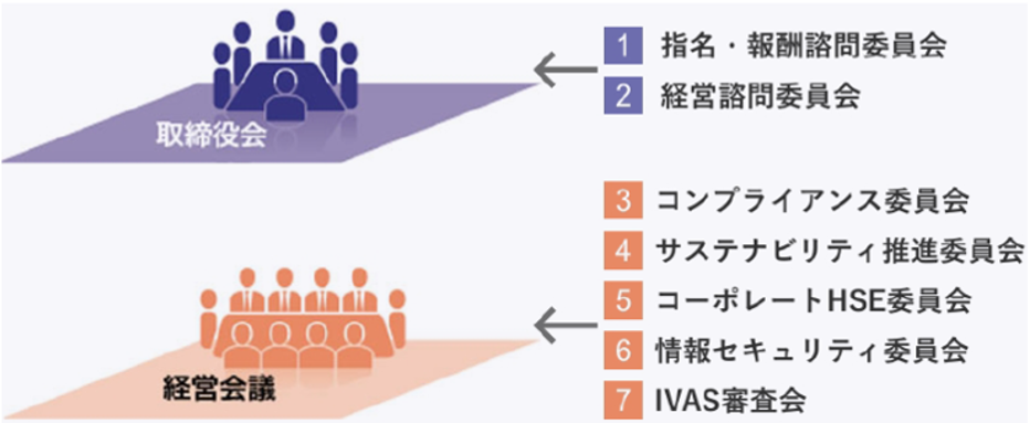 取締役会への諮問機関として、「指名・報酬諮問委員会」及び「経営諮問委員会」を設置しており、また業務執行に係る各種委員会として、「コンプライアンス委員会」、「サステナビリティ推進委員会」、「コーポレートHSE委員会」、「情報セキュリティ委員会」及び「IVAS審査会」を設置しています。各委員会の概要は以下のとおりです。
