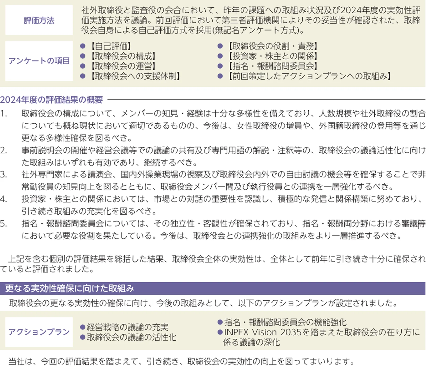 2024年度開催回数:1回国際的な政治経済情勢及びエネルギー情勢の展望、グローバル企業としての経営戦略の在り方、コーポレート・ガバナンスの強化の在り方等の諸課題について、外部有識者から取締役会に多面的かつ客観的な助言・提言を頂き、企業価値及びコーポレート・ガバナンスの向上を目指すことを目的として経営諮問委員会を設置しております。本委員会は同分野に幅広い知見を有する大学教授等国内外の外部有識者から構成され、社内から代表取締役及び経営企画本部長等が出席します。