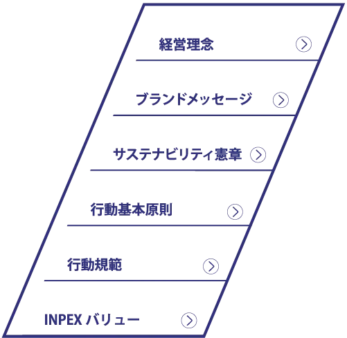 INPEXの理念は、「経営理念」、「サステナビリティ憲章」、「行動基本原則」、「行動規範」に加え、経営理念を具現化するための企業姿勢を端的に示した「ブランドメッセージ」、INPEXの社員・従業員が一体となって働くための共通の基盤「INPEX バリュー」から構成されています。