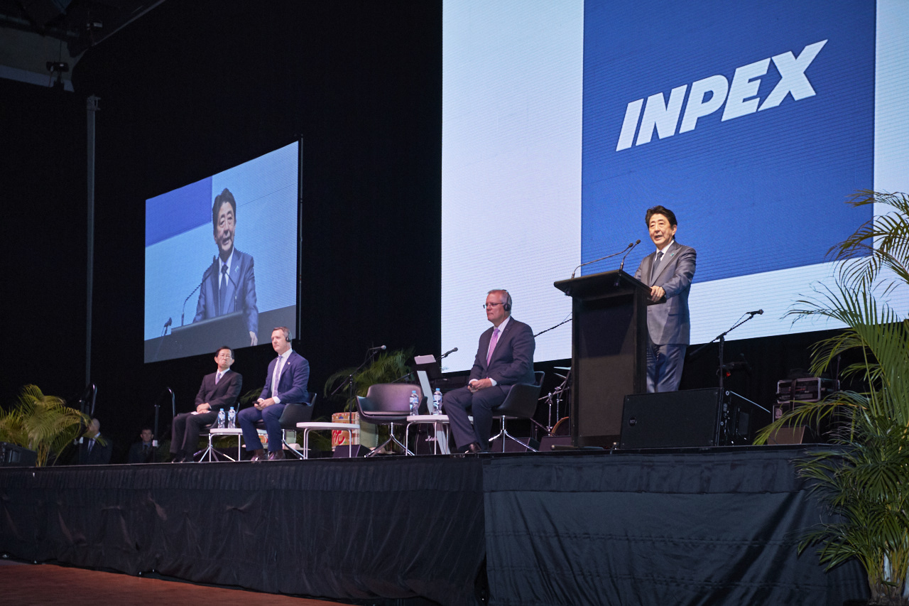 From left: INPEX Chairman Toshiaki Kitamura; the Hon Michael Gunner, Chief Minister of the Northern Territory; the Hon Scott Morrison MP, Prime Minister of Australia; HE Shinzo Abe, Prime Minister of Japan.
