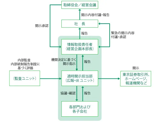 3.収集された情報は、社内規程である職務権限規程に従い、取締役会決議事項の開示については取締役会において、それ以外の開示については経営会議において決議した上で、経営企画本部長の指示により、広報・IRユニットが開示を行います。発生事実等、緊急を要する情報の開示に関しては、代表取締役の承認をもって開示いたします。