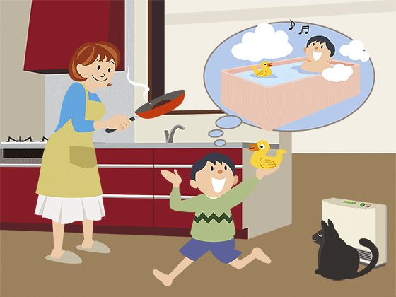 まず、家の中を調べてみましょう。たとえばキッチンでは、ガスコンロやガスオーブン、ガス湯わかし器などにつかわれ、料理や洗い物に役だっています。また、おふろ場ではお湯をわかす熱源や、洗濯物の乾燥につかわれています。リビングでは、床暖房やヒーターとして、部屋をやさしく暖めてくれます。
