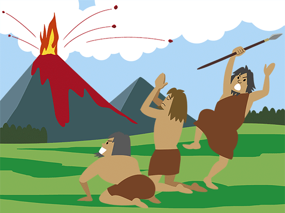 大昔の人々は、どのようにして火を使うようになったのでしょうか。 そもそも人々は、火山が噴火したり、雷が落ちて山火事になったり、といった自然のできごとから火の存在を知ったといわれています。