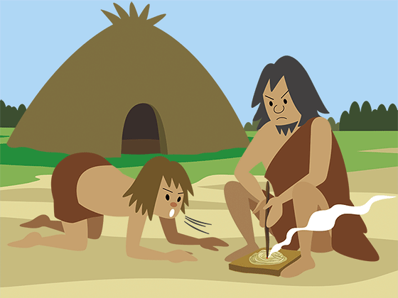 山火事などの自然におこる火をつかうだけでなく、自分たちの手で火をつくりだしたい。そんな思いから人々は、火打ち石をつかうようになりました。石を打ちあわせて火花をおこし、それを燃えやすいものにうつして火をつくる方法です。また、木と木をこすりあわせて熱くし、そこから火をつくる方法も考えだしました。こうして人々は、自由に火をつくりだせるようになりました。